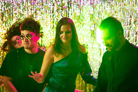 Group of cheerful elegant friends posing together for a photo at nightclub party with disco lights and gold tinsel curtain backdrop