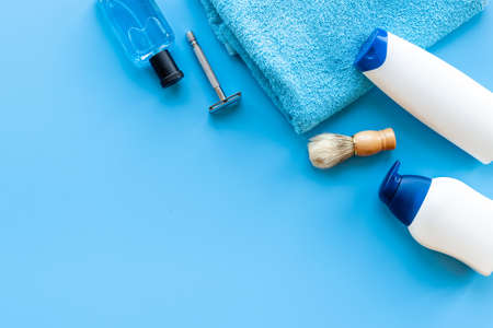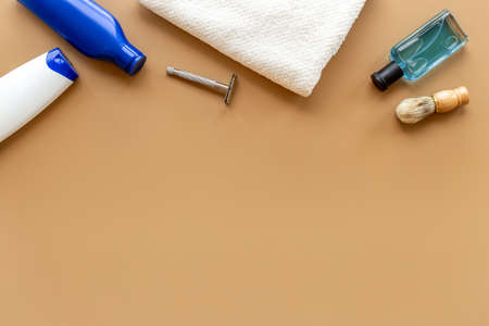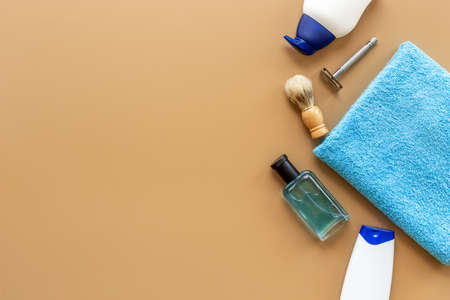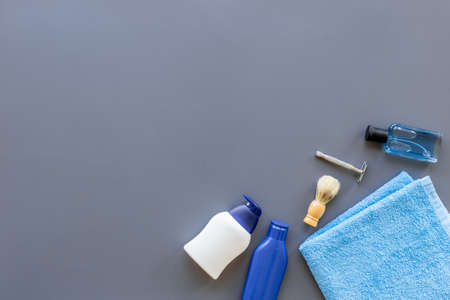 Male cosmetics for bady care grooming and shaving. Layout top view