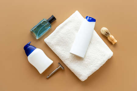 Flat lay of male cosmetic products for men body care grooming and shaving