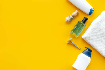 Concept of men's hygiene tools on yellow background