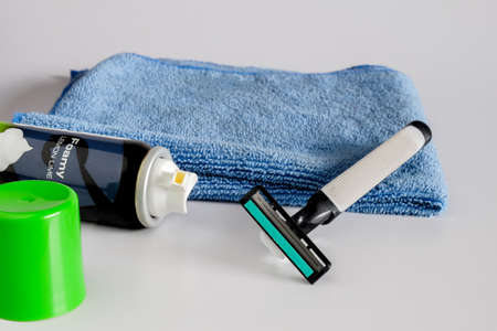 Shaving tools , foam, shaver. Safety razor with shaving cream.