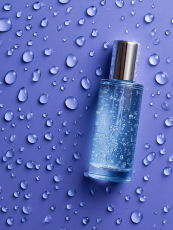 A transparent serum bottle sits on a vivid backdrop, adorned with water droplets, creating an appealing composition that highlights simplicity.