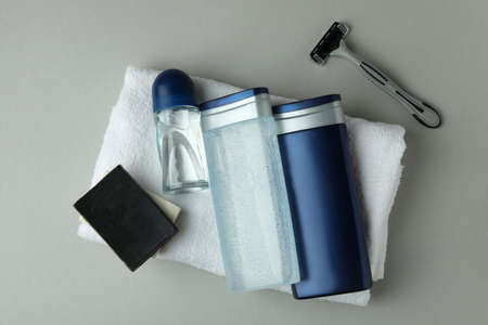 Concept of men's hygiene tools on light gray background