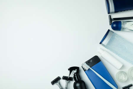Concept of men's hygiene tools on white background