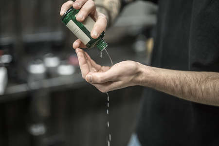 Green bottle with the lotion in the man's hands on the blurry background of the barbershop. Guy is pouring the lotion on his hand. Closeup. Horizontal.
