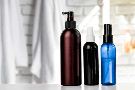 Cosmetic bottles against white bathroom wall background front view