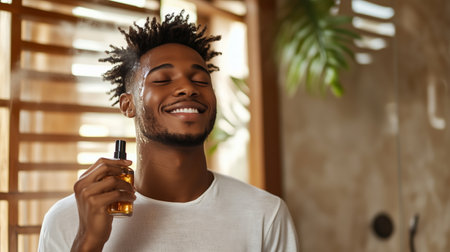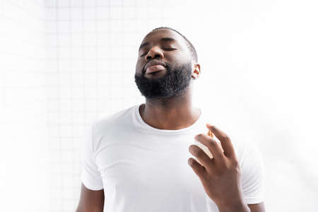 portrait of afro-american man in white t-shirt using perfume