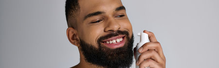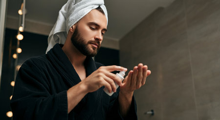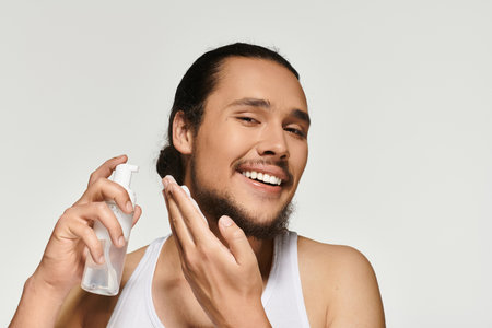 Handsome young bearded man enjoys applying skincare while showcasing a cheerful demeanor.