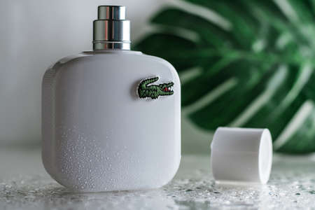 Minsk, Belarus 05/07/2021: White open perfume bottle with Lacoste logo on wet surface with drops on white and monstera leaf background