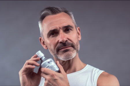 A man is holding a bottle of hair gel in his hand. He is looking at the camera with a serious expression