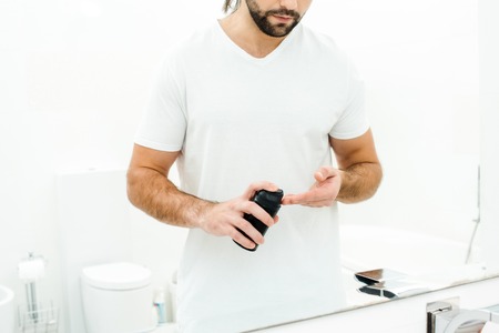 Man holding shaving foam in front of mirror in bathroom