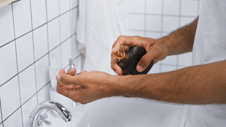cropped view of man applying perfume on hand in bathroom