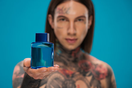 blurred young man with tattoos holding bottle with after shave isolated on blue