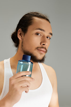 Young man with a beard confidently holding a grooming product against a neutral backdrop.