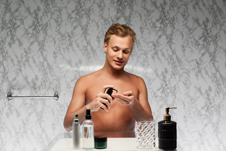 Portrait of young shirtless man applying facial lotion against marbled wall. Morning beauty routine and grooming. Concept of male health, beauty and self care, youth, body and skin care.