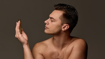 Serious young man holding gold spraying bottle near forehead, exuding luxury and grooming precision, against brown studio background. Concept of selfcare and love, natural beauty, cosmetology.