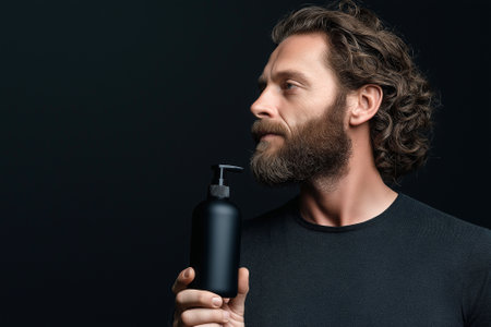 Man holding dark shampoo bottle posing with confident expression against black background. Men's cosmetics