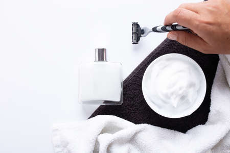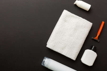 Flat lay composition with men's shaving accessories with copy space on white and dark towel background.