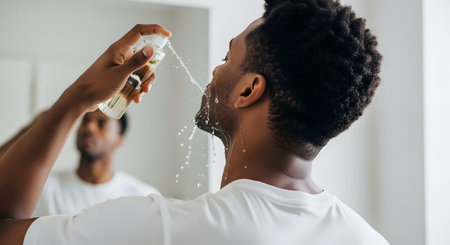 A man is shown from behind, spraying a refreshing facial mist or aftershave onto his face in front of a bathroom mirror, where his reflection is partially visible. This image relates to men's grooming, skincare routines, and self-care.
