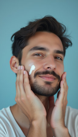 A young man with a well-groomed beard smiles while applying skincare cream to his face, radiating confidence and self-care. The soft blue background enhances the fresh and rejuvenating vibe of the image, making it perfect for beauty and wellness themes.