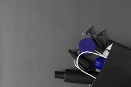 Skincare cosmetics for men in paper bag. Male grooming skin care cosmetic products on gray background. Top view, flat lay. copy space