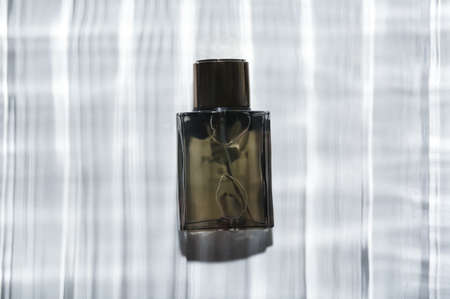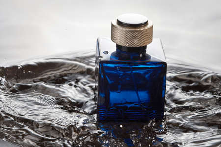 Bottle of perfume for men in water on light background