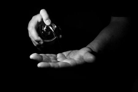 Black perfume bottle in man hand, close up view