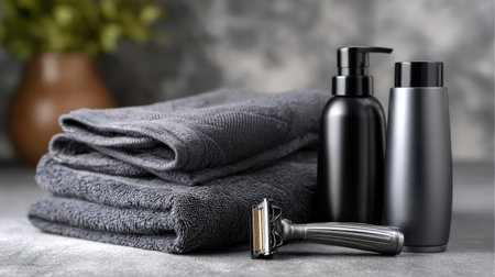 A black bottle of shaving cream sits on a counter next to a gray towel and a razor. Concept of personal grooming and self-care