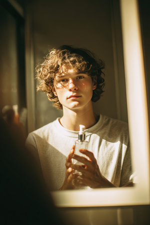 A teenage boy with visible blemishes holds a cleanser bottle, examining his face in a well-lit mirror. His calm, focused expression suggests a skincare routine in progress.