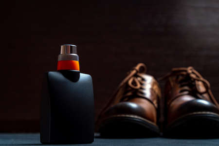 Matte black perfume bottle with silver lid. Against the background of blurred men's shoes brown.