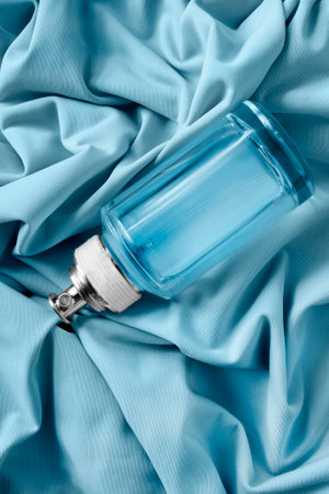 Blue glass perfume bottle lying on light blue draped silk fabric background