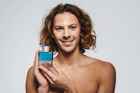 Happy shirtless guy smiling while posing with perfume isolated over white background