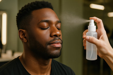 Man with eyes closed receiving facial mist spray from a clear bottle, skincare routine for healthy hydrated complexion indoors.