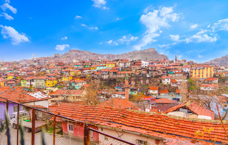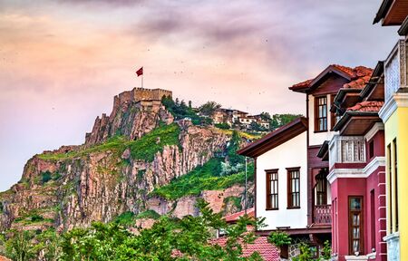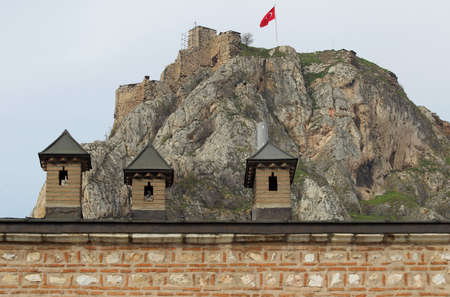 Traditional Afyonkarahisar houses and Afyon Castle in Afyonkarahisar Turkey