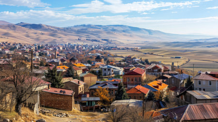 Cappadocia from above. Summer, sunny day. There is a village in the valley, many houses with red roofs. There are unusual rocks and beautiful mountains around. Blue sky with scenic clouds. Turkey.