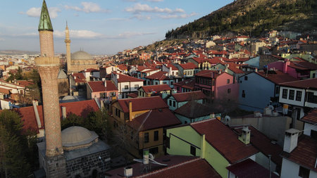 Colorful traditional ottoman houses and a mosque in the old town center of Afyon, Turkey