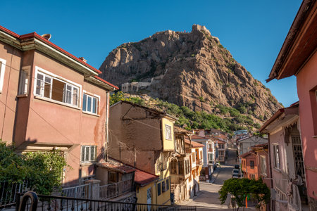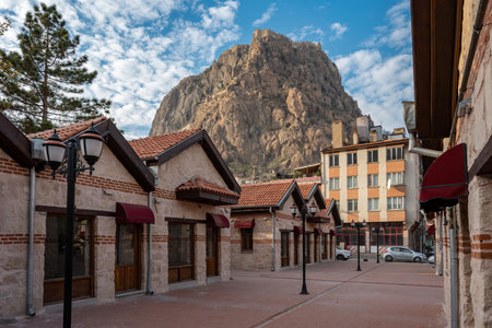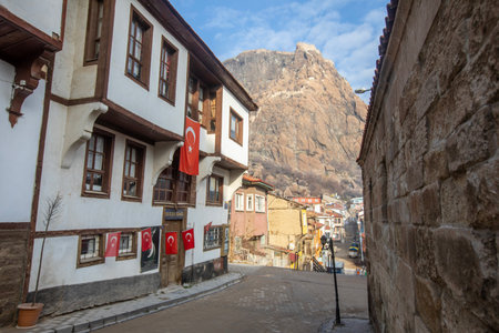 Street with traditional turkish ottoman houses in Afyonkarahisar old town. Afyonkarahisar cityscape Afyon castle on the rock,
