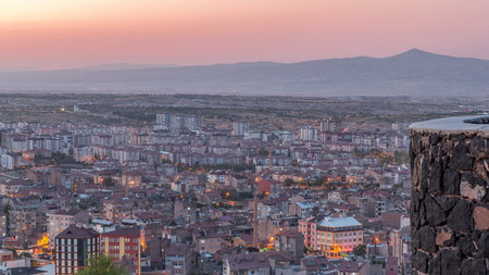 Aerial view from old castle in historical city town of Nevsehir day to night timelapse