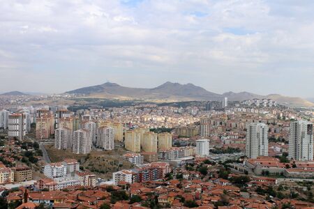 Ankara, Turkey - July 24, 2018: View above of Ankara houses with tiled roofs and skyscrapers in summer cloudy day