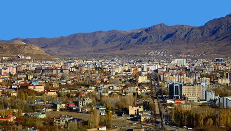 Dogubeyazit, Turkey - May 10, 2019: Evening in and overview over Dogubeyazit with mountains in the background, Turkey.