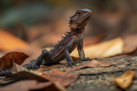 Boyds forest dragon posing on fallen leaves in australian rainforest
