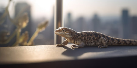 A reptile contemplates the cityscape from a window amidst towering skyscrapers.
