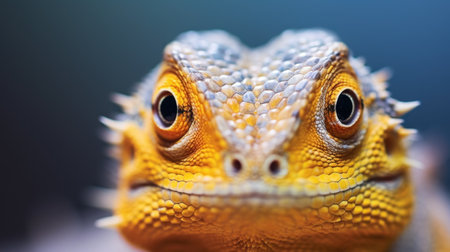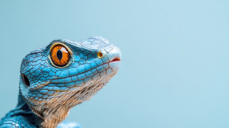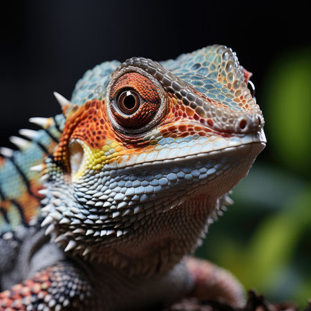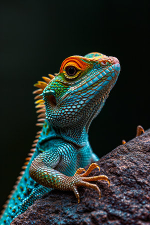 A vibrant close-up image of a reptile showcasing its colorful scales and striking eyes. The detailed texture highlights its natural beauty in a captivating pose.