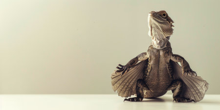 frilled dragon lizard poses with frill fully open showcasing vibrant details while standing in alert position against a pure white backdrop well lit for clarity.