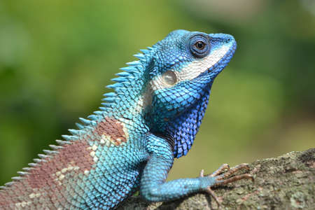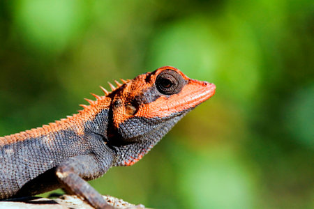 Oriental garden fence lizard or Calotes versicolor sitting on a branch in the tropical jungle. Asian lizard on a blurred background of green forest. Animal of Asia, reptile
