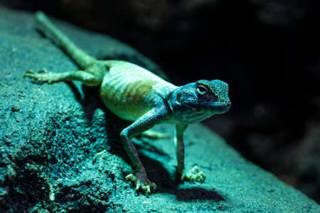 Sinai agama (Pseudotrapelus sinaitus, formerly Agama sinaita) very close up on a rock at night prepared to jump off.