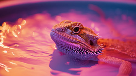 A lizard is swimming in a bowl of water with pink and purple lights, AI