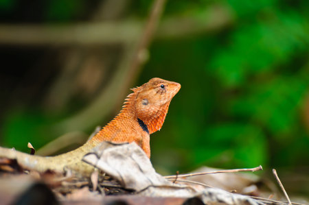 Oriental garden fence lizard or Calotes versicolor sitting on a branch in the tropical jungle. Asian lizard on a blurred background of green forest. Animal of Asia, reptile