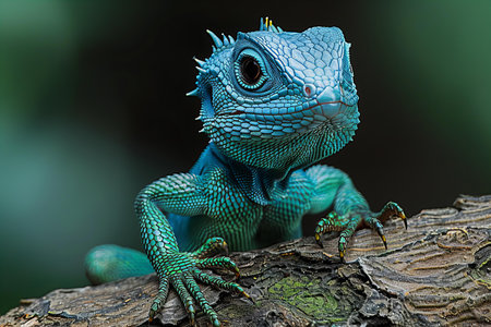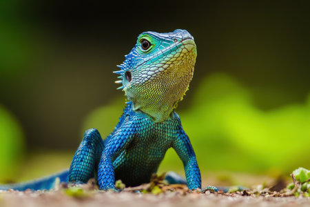 Photo of a blue and green lizard on the ground, with its head tilted up against a solid background. The focus is sharp and clear, highlighting every detail from its spiky tail to its vibrant scales. It stands tall in front of an emerald backdrop that contrasts beautifully with its colors. Captured in the style of Nikon D850 DSLR camera with an aperture setting of f/4 at ISO 230 for a shallow depth of field. --ar 3:2 --v 6.1 Job ID: 05cc4d6a-abc5-430a-b851-e11f3dcf760f
