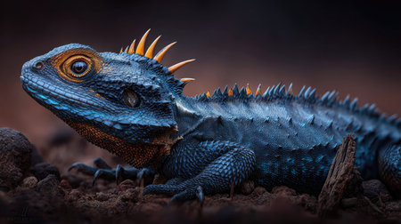 a close-up photo of a vibrant lizard showcasing bright colors, rendered in the style of vray tracing. the lizard stands out against a black background, with its scales displaying a striking combination of light amber and purple hues. the spiky mounds on its body add texture, while softbox lighting highlights its strong facial expression. the image is enhanced by the use of varied brushwork techniques.